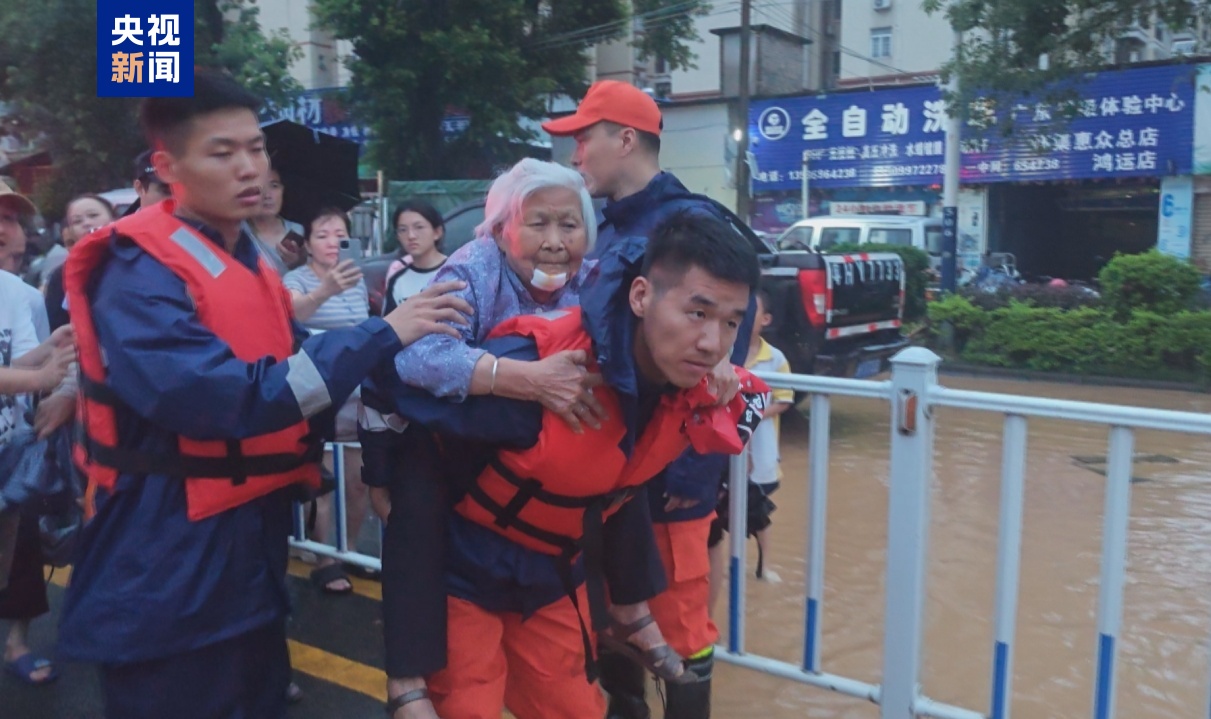 發現被困人員後,消防員立即為他們穿上救生衣,利用橡皮艇或者安全繩搭建的救援通道,將被困羣眾逐一轉移到安全地帶。遇到老人和兒童,消防員就把他們背在身上,保證他們的安全。