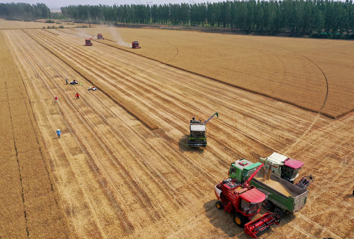 大型聯合收割機在金黃的麥浪裏穿梭,收割、脱粒、入倉一氣呵成,規定作業麥田沒多久就只留下短短的麥茬……這是記者在多地看到的夏收景象。