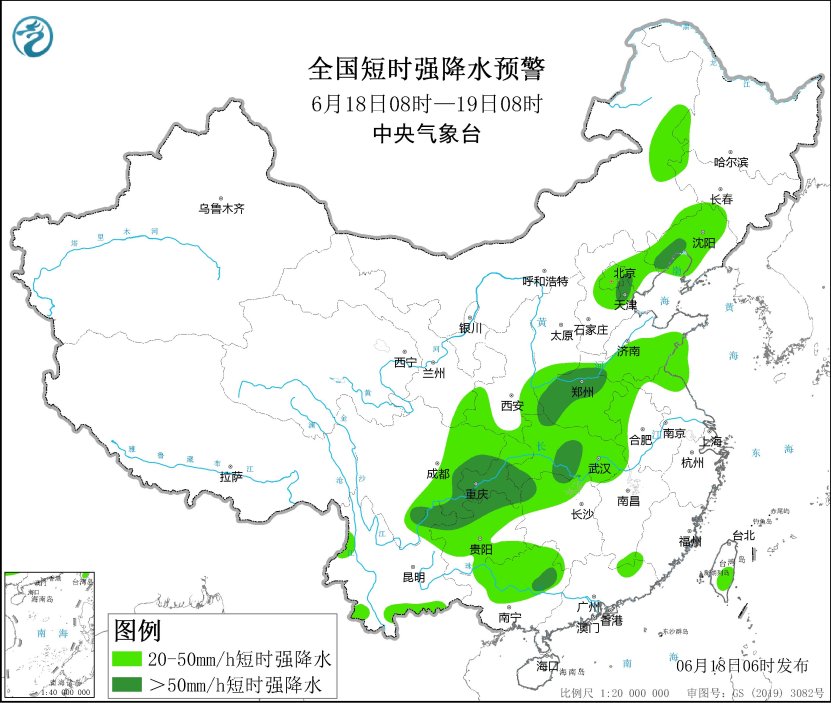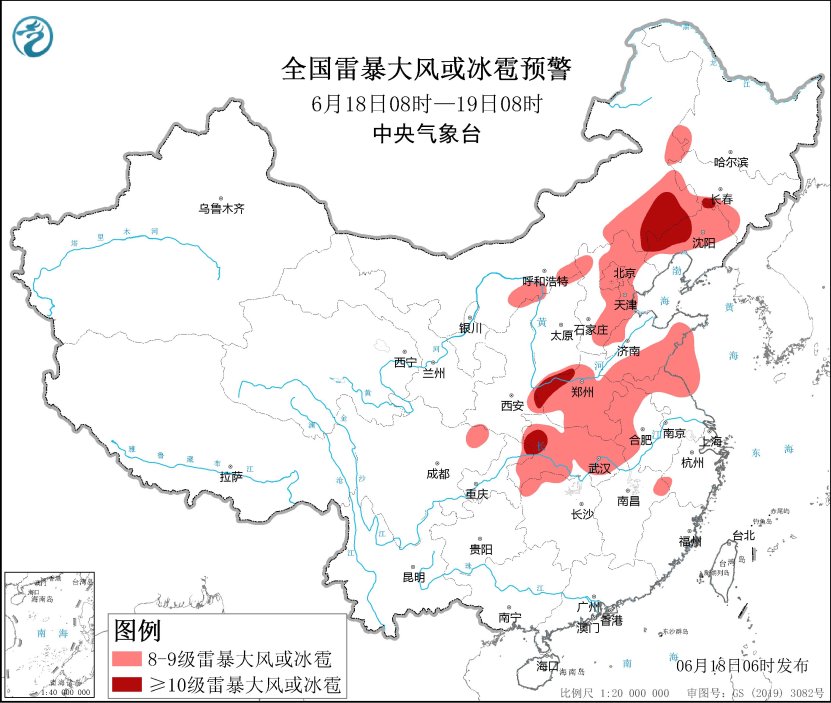 預計6月18日08時至19日08時,內蒙古中東部、東北地區南部、華北北部和東部、黃淮、江淮西部、江漢、江南北部等地的部分地區將有8級以上雷暴大風或冰雹天氣,其中,內蒙古東南部、吉林南部、遼寧西部、河南西北部、湖北西北部等地的部分地區將有10級以上雷暴大風,最大風力可達11級以上,內蒙古東南部、遼寧西部等地局地不排除出現龍捲的可能性;內蒙古東部、東北地區南部、華北東部、黃淮、江淮西部、江漢、江南西北部、西南地區東部、華南北部等地的部分地區將有小時雨量大於20毫米的短時強降水天氣,其中,遼寧西部、天津、河南北部和西部、湖北中部和西南部、重慶、四川東南部、貴州北部、廣西東北部等地的部分地區小時雨量大於50毫米,最大可達80毫米以上。
