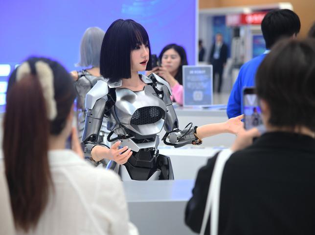 仿生人形機器人在2024中關村論壇年會會場設置的諮詢台“迎賓”(2024年4月27日攝)。新華社記者 任超 攝