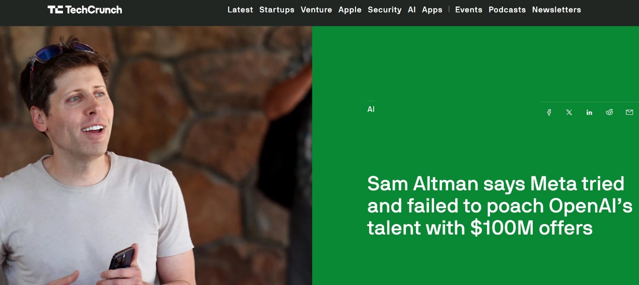 【環球網科技綜合報道】6月18日消息,據techcrunch報道,Meta 首席執行官馬克・扎克伯格近期積極招募頂尖人工智能研究人員,以充實 Meta 新的超級智能團隊。其中,Meta 向 OpenAI 和谷歌 DeepMind 的員工提供了高達 1 億美元的薪酬待遇,試圖挖角。然而,OpenAI 首席執行官 Sam Altman 在播客中證實,儘管 Meta 開出了極具吸引力的條件,但至今未能成功從 OpenAI 挖走人才。