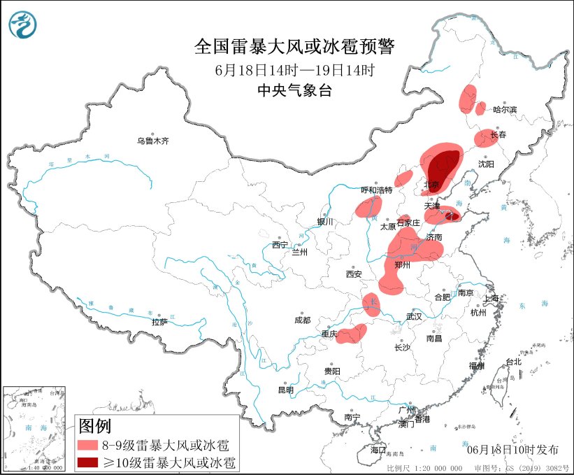 預計6月18日14時至19日14時,內蒙古東南部、東北地區西部、華北東部和南部、黃淮西部和北部、江漢、西南地區東部等地的部分地區將有8級以上雷暴大風或冰雹天氣,其中,內蒙古東南部、遼寧西部、河北東北部、天津北部、山東北部等地的部分地區將有10級以上雷暴大風,最大風力可達11級以上,內蒙古東南部、遼寧西部等地局地不排除出現龍捲的可能性;內蒙古東部、東北地區南部、華北東部和南部、黃淮、江淮西部、江漢、江南西部、西南地區東部、華南北部等地的部分地區將有小時雨量大於20毫米的短時強降水天氣,其中,遼寧西部、河北東北部、北京東北部、山東北部、河南西部、湖北中部和西南部、湖南西北部、重慶東南部、貴州東南部、廣西東北部等地的部分地區小時雨量大於50毫米,最大可達80毫米以上。