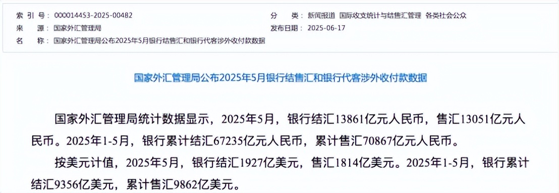 【環球網財經綜合報道】國家外匯管理局6月17日公佈數據顯示,2025年5月銀行結匯1927億美元,售匯1814億美元,結售匯順差113億美元。銀行代客涉外收入6227億美元,對外付款5897億美元,涉外收付款順差330億美元。1至5月累計數據顯示,銀行結匯9356億美元,售匯9862億美元;銀行代客涉外收入32128億美元,對外付款31109億美元。
