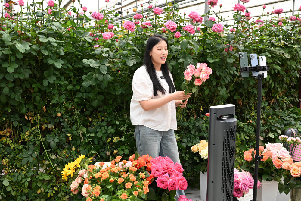 5月24日,在莒縣招賢鎮曲坊現代農業產業園的玫瑰基地,工作人員通過網絡直播銷售鮮切玫瑰花。新華社記者 馬寧 攝