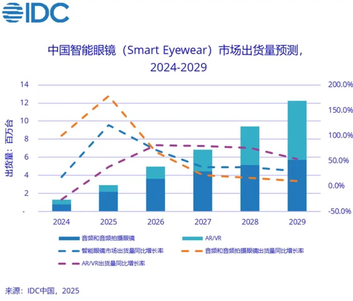 2025年中國智能眼鏡(Smart Eyewear)市場出貨量預計達到290.7萬台,同比增長121.1%,其中音頻和音頻拍攝眼鏡出貨量預計216.5萬台,同比增長178.4%;AR/VR設備出貨量預計74.2萬台,同比增長38.1%。