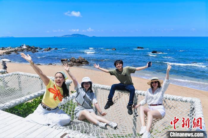6月8日,華僑大學“海外新聲代”工作室成員在三亞天涯海角遊覽區合影。 (海南省國際文化交流中心 供圖)