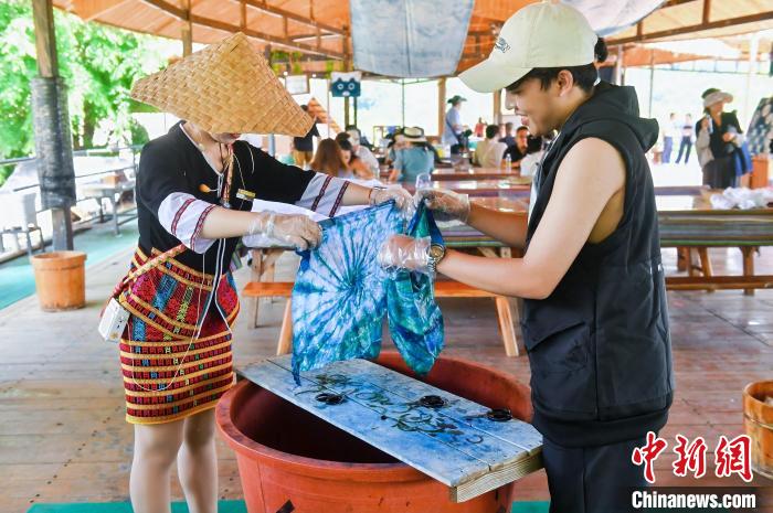 6月9日,印尼博主陳浩傑(右一)在海南檳榔谷黎苗文化旅遊區體驗苗族扎染。(海南省國際文化交流中心 供圖)