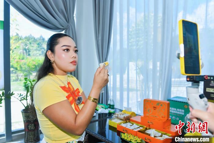 6月8日,泰國博主羅雅菲在優旗大嘴鳥榴蓮一號基地直播展示三亞榴蓮產品。(海南省國際文化交流中心 供圖)