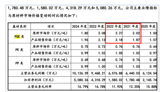 招股書數據顯示,2022-2024年能之光主要原材料POE市場價格分別為2.27萬元/噸、2.08萬元/噸、1.8萬元/噸,而公司採購單價為2.06萬元/噸、1.8萬元/噸、1.5萬元/噸,採購價較市場價低9.25%-16.67%;更反常的是,2021年POE類產品售價1.87萬元/噸,低於當年原料市場價0.15萬元/噸,形成“售價低於原材料成本”的倒掛現象。對此,本網記者發函求證,截至目前未收到回覆。
