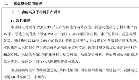 能之光募集資金投資項目之一是功能高分子材料擴產項目。招股説明書稱,該項目規劃增加功能高分子材料3萬噸,包括低VOC功能化材料、粘合樹脂、功能複合材料,進而鞏固公司的市場競爭優勢,提高公司的行業地位和整體盈利能力。