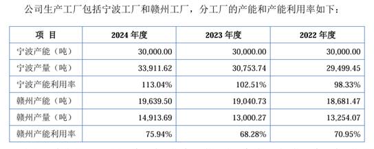 更值得關注的是,招股書披露,報告期內,公司贛州基地2022-2024年產能利用率始終低於80%(70.95%、68.28%、75.94%),現有產能尚未充分消化。若按環評7.4萬噸計算,贛州基地產能將較現有水平激增277%,大幅擴產或面臨市場消化壓力。