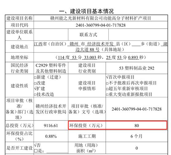 按此推算,項目建成後,贛州能之光產能約為4.96萬噸。但贛州市生態環境局公示的環評報告顯示,該擴產項目達產後產能為7.4萬噸,較招股書多出2.44萬噸。