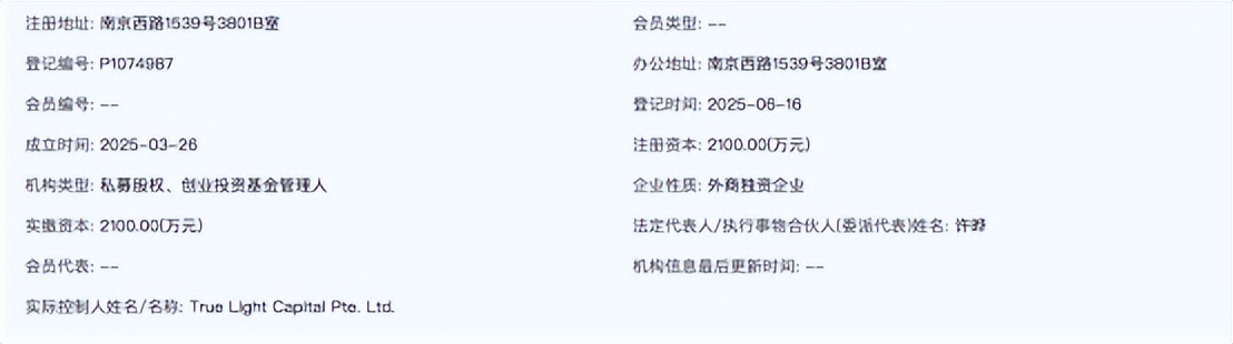 據瞭解,淡明私募成立於2025年3月26日,註冊資本2100萬元人民幣,註冊地和辦公地均位於上海市靜安區。該公司為外商獨資企業,由新加坡淡馬錫旗下獨立全資子公司True Light Capital Pte. Ltd.(淡明資本)全資持股。