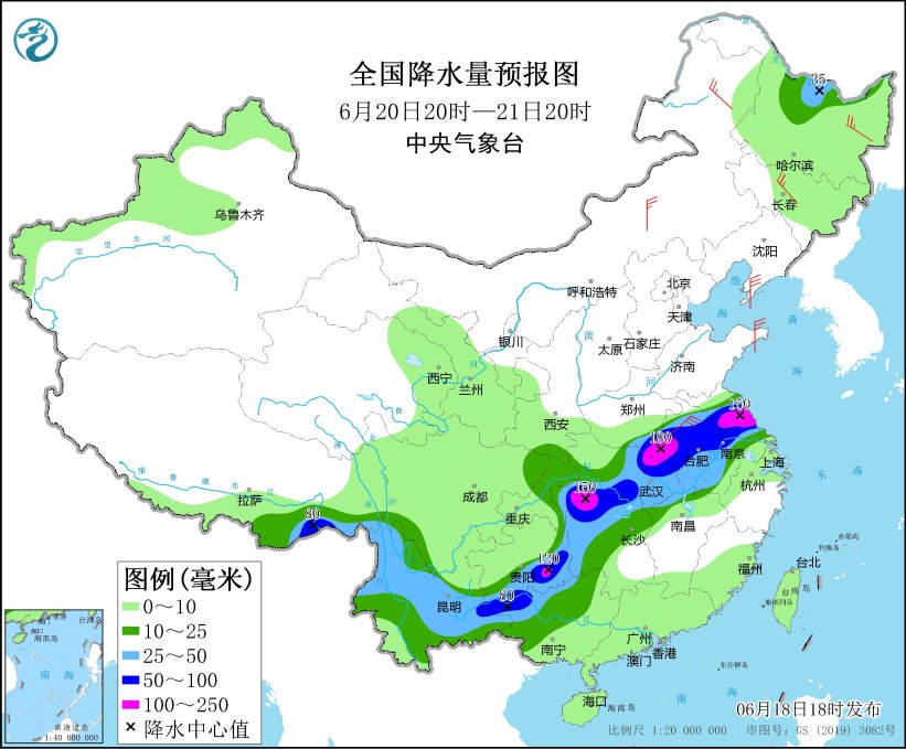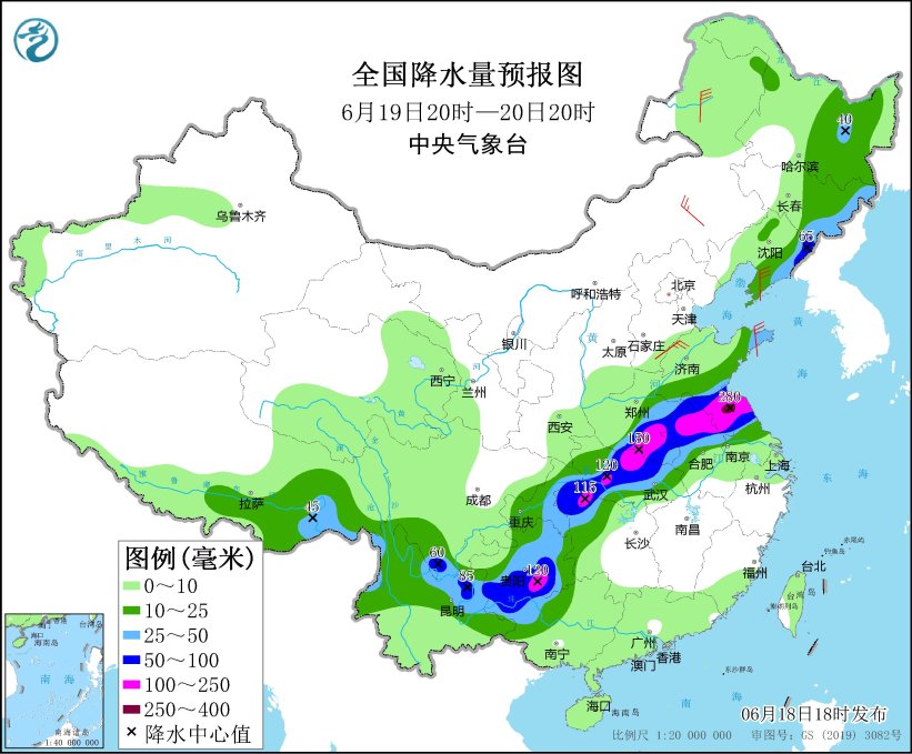 *6月19日20時至20日20時,*東北地區東部、黃淮南部、江淮大部、江漢、江南西部、西南地區東部和南部、廣西西北部等地部分地區有中到大雨,其中,遼寧東北部、河南東南部、蘇皖北部、湖北中部和西南部、湖南西北部、重慶東北部、貴州南部、雲南東北部、廣西西北部等地部分地區有暴雨到大暴雨,江蘇北部局地有特大暴雨(250~280毫米)。內蒙古東部、遼東半島、山東半島等地有4~6級風(見圖4)。