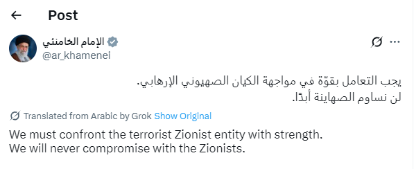 △哈梅內伊社交媒體平台聲明截圖