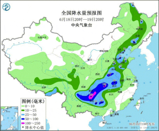 *預計,*6月18日20時至19日20時,貴州、四川南部和東部、重慶、廣西北部、湖北、湖南西部和北部、河南中東部以及河北東部和南部、山東中西部、天津南部、遼寧北部等地部分地區有大到暴雨,其中,河南中部、湖北西南部、湖南西北部、貴州中北部等地部分地區有大暴雨(100至180毫米)。