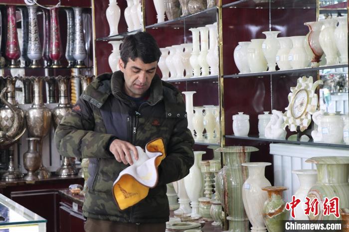 皮亞爾·卡里姆在店裏擦拭玉器。(資料圖)苟繼鵬 攝