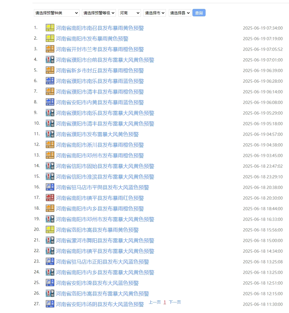 全省自北向南轉偏北風3到4級,陣風6級左右。最高氣温:西部、南部24℃到26℃;其他縣市27℃到29℃。 最低氣温:西部20℃到22℃;其他縣市22℃到24℃。截至早上8點10分,河南27個暴雨、雷暴大風等預警信號生效中。
