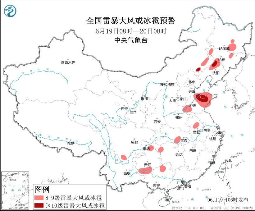 預計6月19日08時至20日08時,東北地區中南部、華北東南部、黃淮中東部、江漢、西南地區東部、華南西北部等地的部分地區將有8級以上雷暴大風或冰雹天氣,其中,遼寧西部和北部、山東中北部等地的部分地區將有10級以上雷暴大風,最大風力可達11級以上;東北地區中南部、華北東部和南部、黃淮、江淮、江漢、江南西部和中北部、西南地區東部、華南北部等地的部分地區將有小時雨量大於20毫米的短時強降水天氣,其中,山東中東部和南部、河南東部、江蘇中部、湖北東部和南部、湖南西北部、貴州西南部等地的部分地區小時雨量大於50毫米,最大可達80毫米以上。