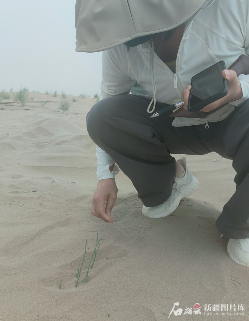 6月16日,在巴楚縣瓊庫爾恰克鄉温阿勒台庫什村的廣袤沙漠中,“環着沙漠看新疆”全媒體報道團隊的記者圍着一株梭梭樹苗,難掩驚喜。這株今年3月種下的梭梭苗,此前已經被風沙掩埋,若不是記者行走沙丘時意外踢開沙土,它仍將“沉睡”在黃沙下。