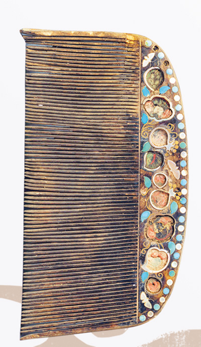 甘肅武威市博物館藏唐鑲螺鈿綠松石八寶紋骨梳。