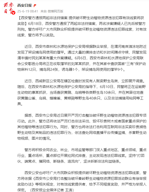 6月18日,西安警方通報了兩起非法狩獵案,兩名涉案嫌疑人已先後被警方刑拘。警方呼籲廣大市民羣眾積極提供破壞野生動植物資源違法犯罪線索,對有效線索,警方將予以獎勵。