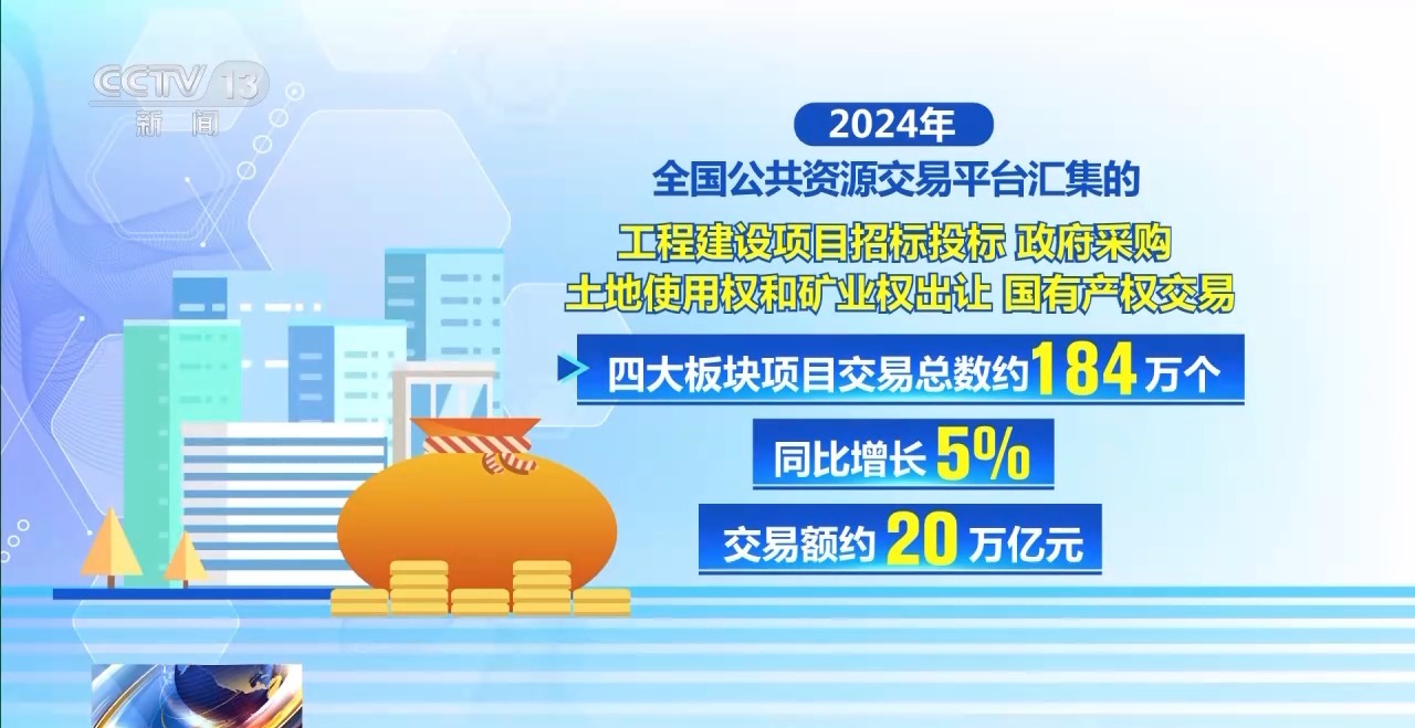 另外,公共資源交易方面,2024年,全國公共資源交易平台彙集的工程建設項目招標投標、政府採購、土地使用權和礦業權出讓、國有產權交易四大板塊項目交易總數約184萬個,同比增長5%,交易額約20萬億元。