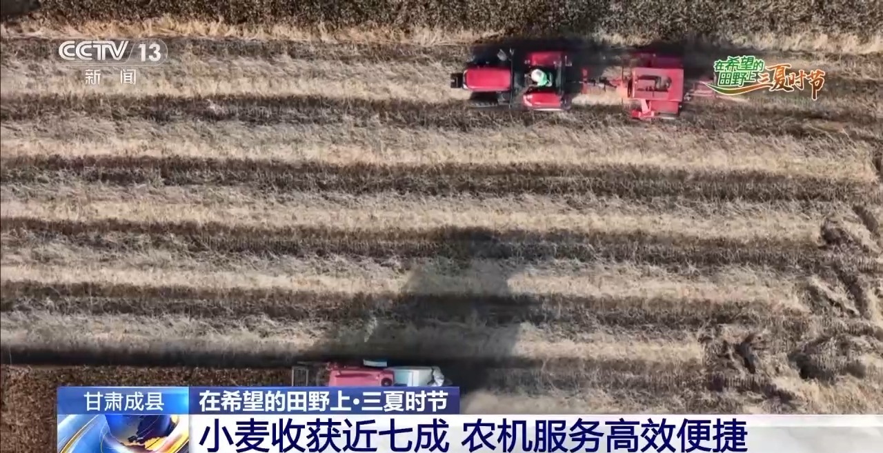甘肅省隴南市成縣蘇元鎮水壩村的全國綠色食品原料標準化生產基地內,1600畝小麥近日進入收穫高峯。農户自清晨6時起搶收小麥。該區域一片約20畝的麥田,過去需20人勞作5天完成收割、脱粒至晾曬全過程;如今1台機械作業3小時即可完成收割與脱粒,效率顯著提升。