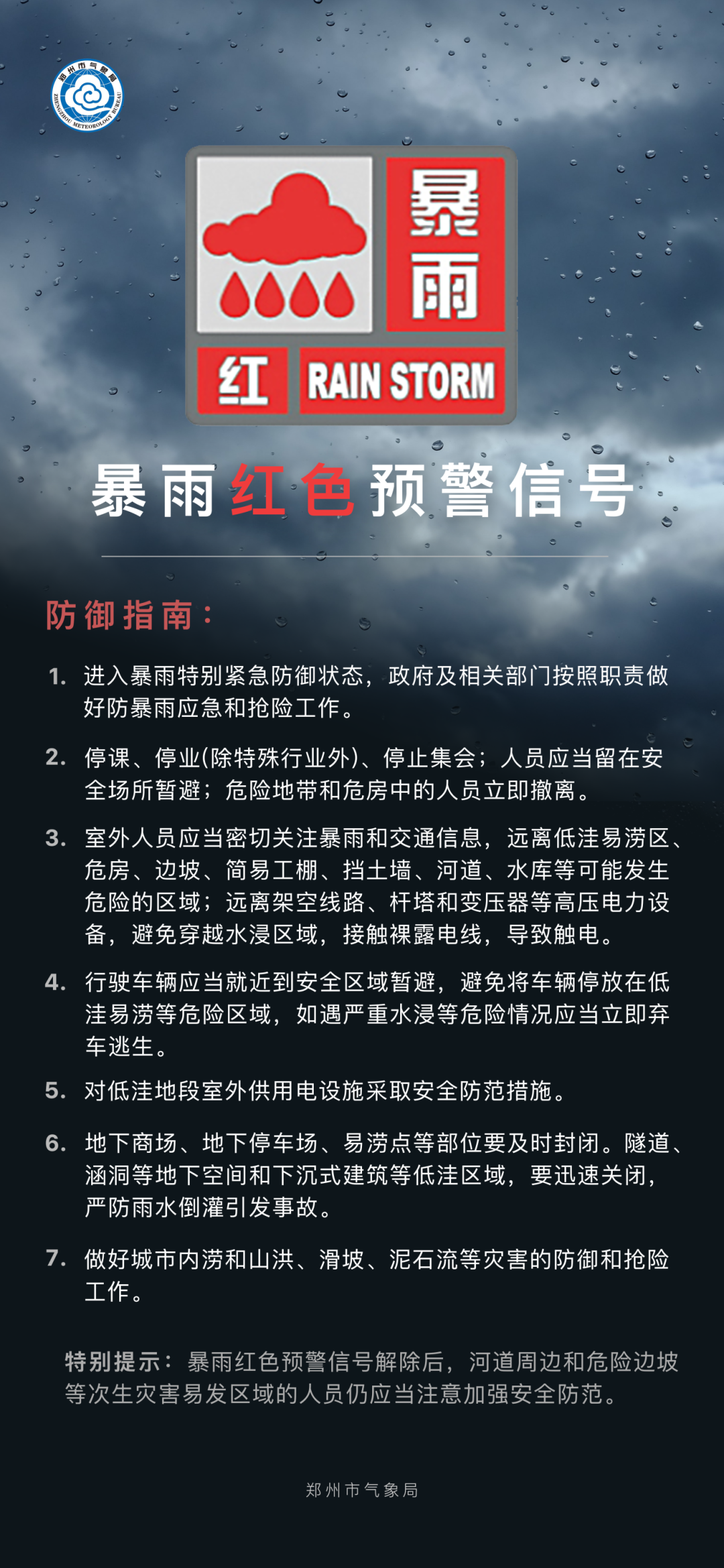 *鄭州市氣象台2025年6月19日13時43分發布暴雨紅色預警信號:*目前航空港區已出現100毫米以上降水,最大降水量130.5毫米。預計未來3小時航空港區所轄鄉鎮及街道降水持續,還將出現30到40毫米的降水。請注意防範強降水可能引發的中小河流洪水、城鄉積澇等次生災害,相關部門需加強防洪防汛和交通安全管理;公眾出行注意避開低窪易澇等危險區域,行駛車輛應當就近到安全區域暫避。