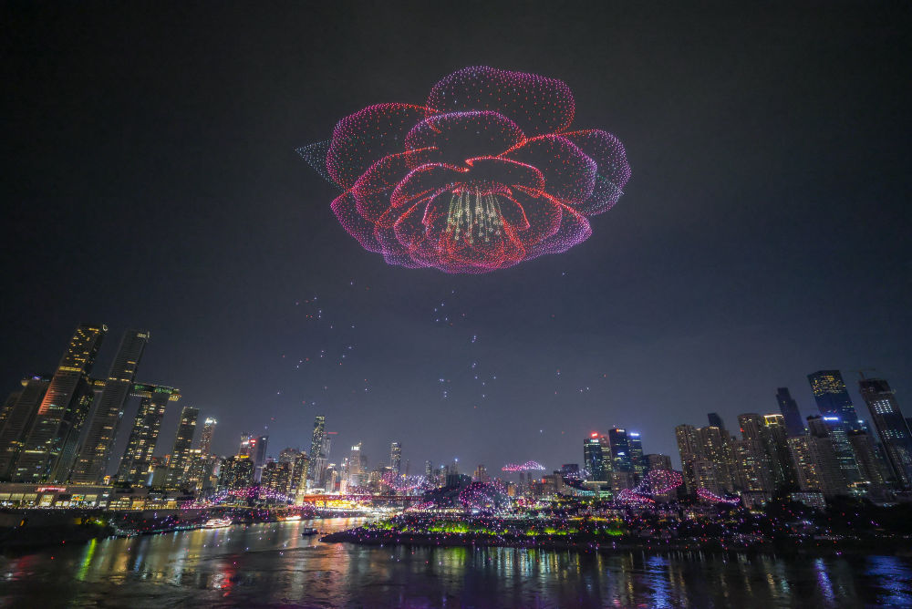 6月17日,在重慶地標朝天門,長江和嘉陵江交匯處,11787架無人機翩然起舞。夜空中,一朵巨型的重慶市花山茶花,層疊舒展,片片花瓣散落江面。