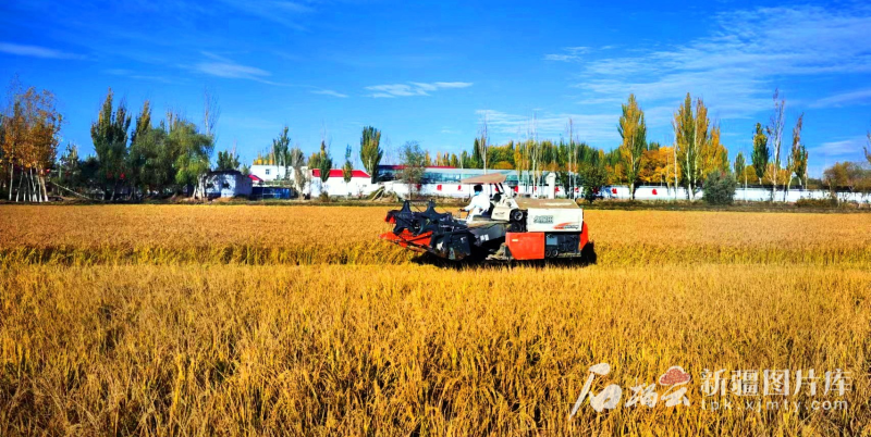 收割機在帕哈太克里鄉肖爾巴格村田間收割水稻(2022年攝)。阿地力江·阿不都卡德爾攝