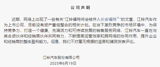 【環球網財經綜合報道】6月19日,江鈴汽車發佈公告,堅決否認了旗下合資品牌江鈴福特將併入長安福特的傳聞。近期網絡上出現相關文章,稱江鈴福特將被併入長安福特體系,進行資源整合,甚至表示未來中國市場上將只存在“一個福特”品牌。但江鈴汽車明確表示,目前沒有資產重組整合的相關計劃,並拒絕評論毫無根據的謠言和猜測。