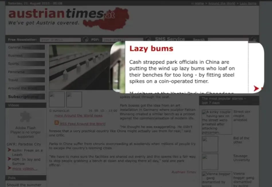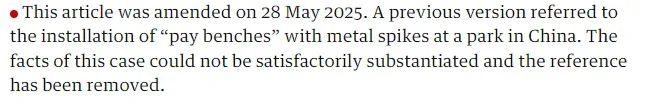 但讓特拉斯代爾困惑的是,無論是問中國朋友還是查閲中國網站,她都找不到這個所謂的“中國公園尖刺長椅”。在好奇心的驅使下,她先點進《衞報》所謂的信息來源鏈接,頁面轉到了一個英國趣聞網站。