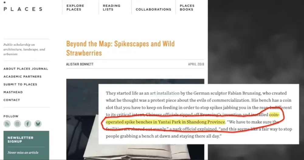 經過一輪溯源後,特拉斯代爾在一個名為《奧地利時報》的小網站上找到了出處。這篇報道自稱“採訪”了煙台這個公園管理員,但評論區卻有網友揭露,這個報道里所謂“尖刺長椅”其實是德國一個行為藝術家的創作,作為“證據”的圖片是這個網友拍的,卻被該網站挪用篡改成這樣一個謠言。