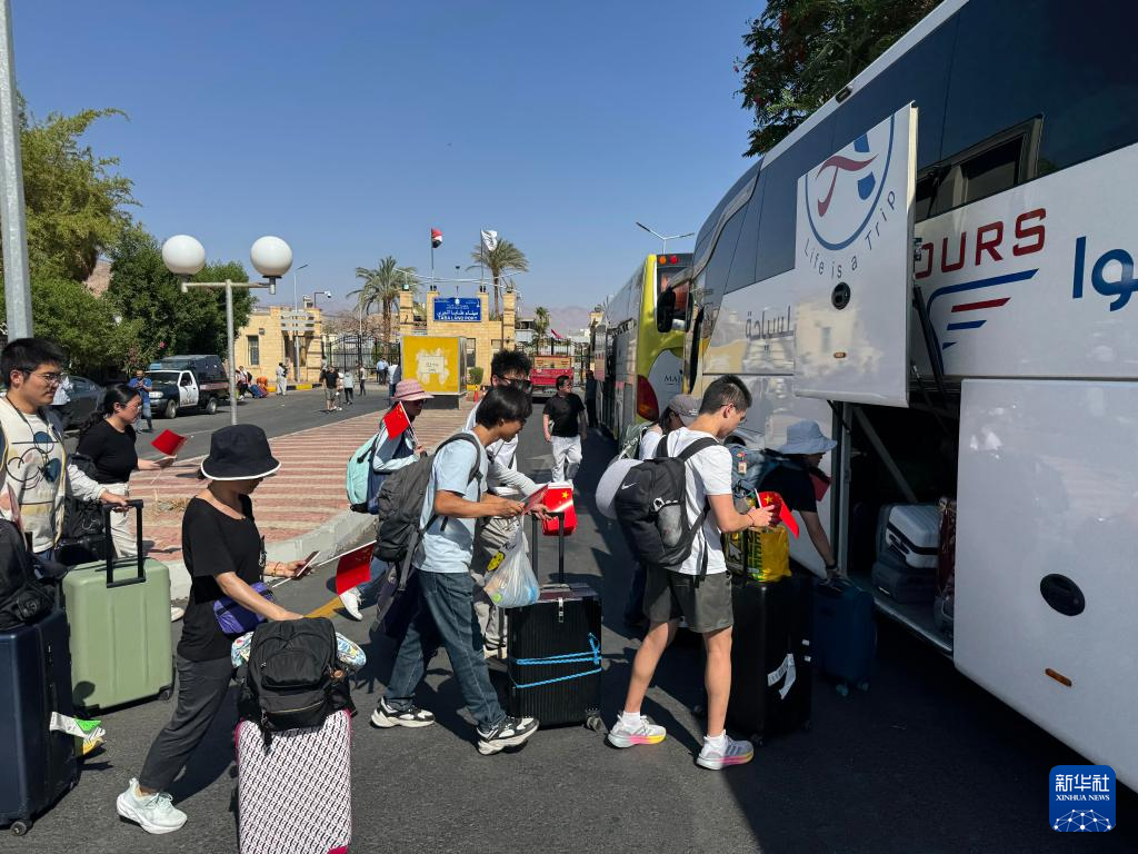 6月19日,在埃及南西奈省塔巴口岸,從以色列撤離的中國公民準備乘車離開。新華社發(艾哈邁德·戈馬攝)