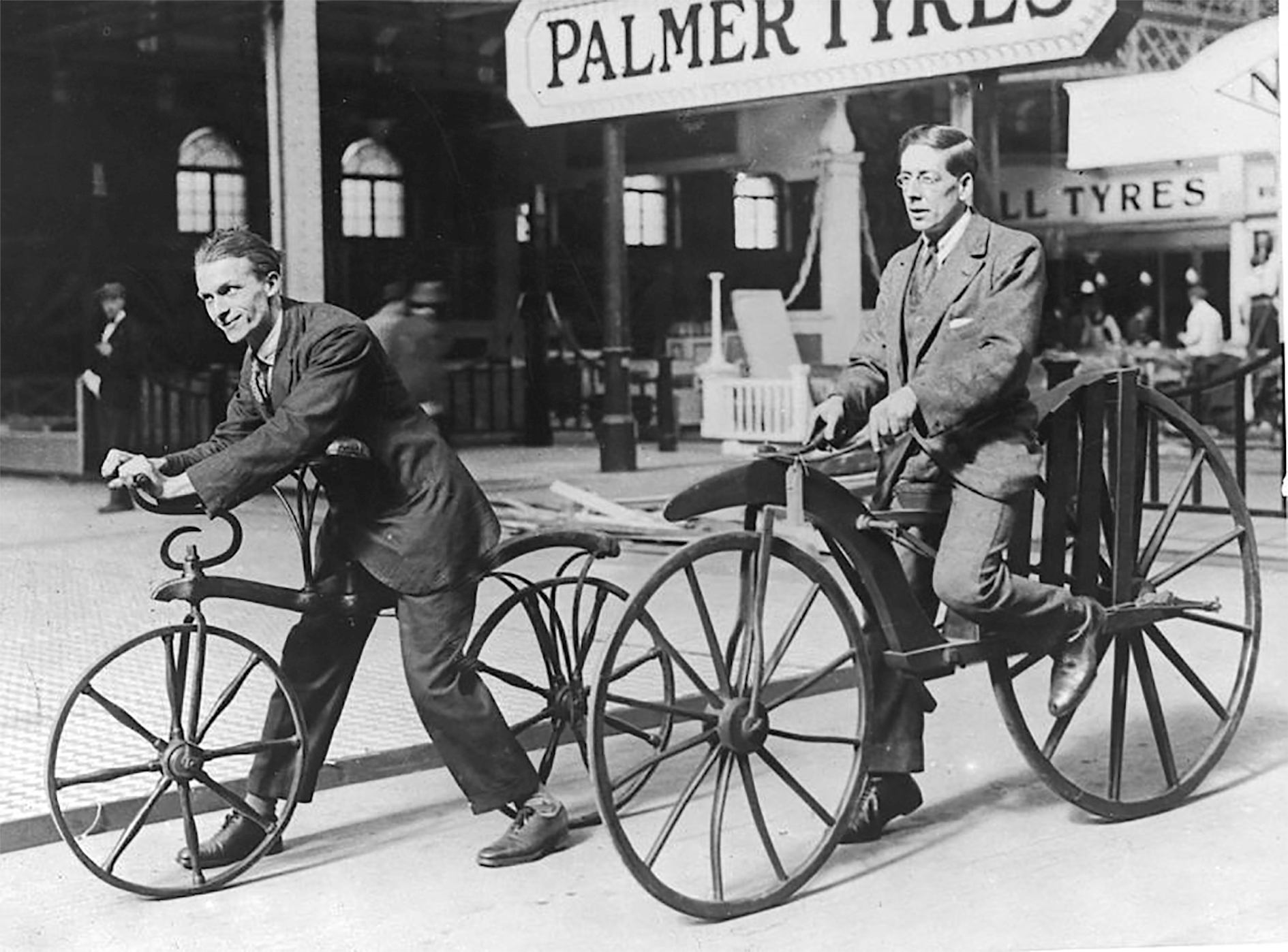 19世紀60年代,法國發明家歐內斯特·米蕭與皮埃爾·拉雷蒙德打造出首款腳踏板驅動的兩輪車,自行車的進化才“迴歸正軌”。不過,法國人發明的“腳踏車”是將踏板置於前輪,車身較為笨重,輪子也是金屬打造。如果在顛簸的路面上騎行,沒什麼減震設計的車子會把騎手震得渾身疼,為此它又被形象地稱為“震骨器”。