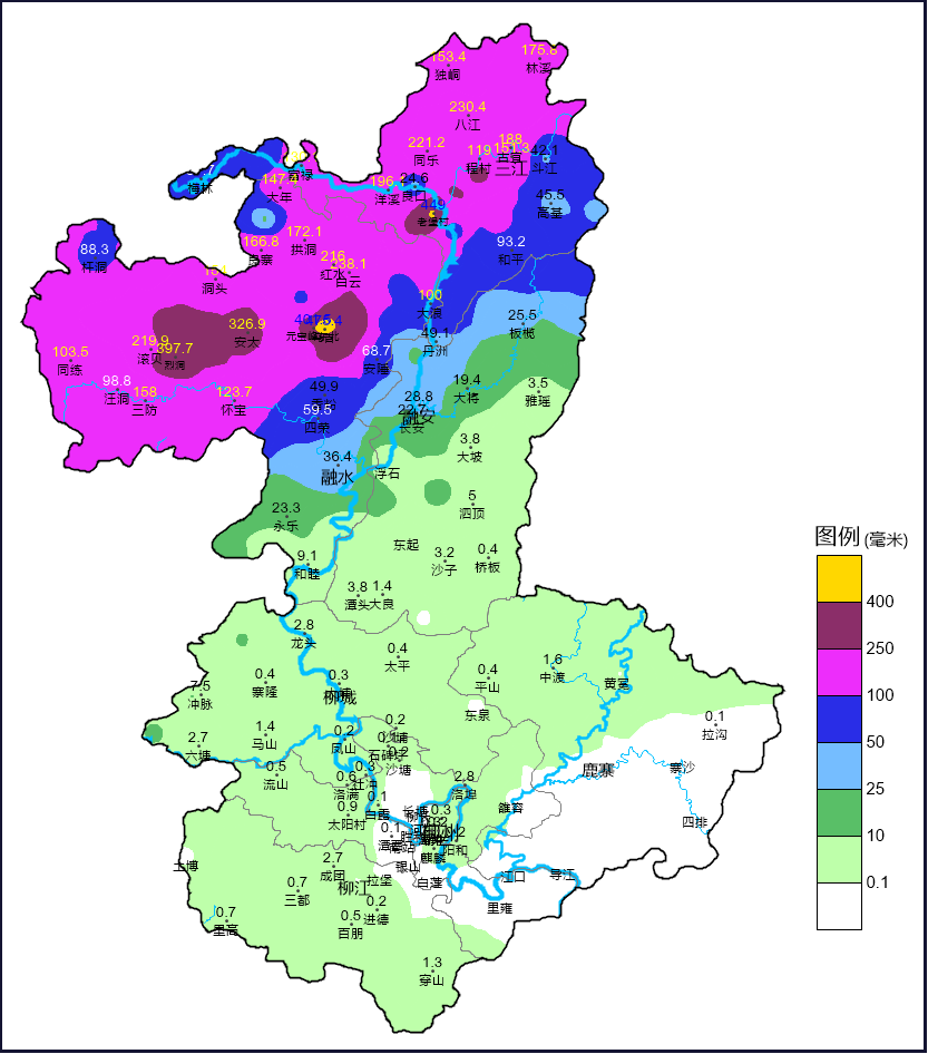 據實況監測,6月19日7時至20日7時,三江和融水中北部出現暴雨到大暴雨、局地特大暴雨,特大暴雨涉及5個鄉鎮,大暴雨涉及24個鄉鎮,暴雨涉及3個鄉鎮,大雨涉及4個鄉鎮,最大雨量為融水安陲烏吉475.4毫米,三江老堡村449.0毫米,融水元寶峯412.3毫米;最大1小時雨量61毫米(三江老堡村,20日0時)。過程以來(6月17日20時至20日07時),累計雨量大於250毫米的有21個鄉鎮,100~250毫米有10個鄉鎮,50~100毫米有6個鄉鎮,最大雨量825.2毫米(融水安陲烏吉),最大1小時雨量61毫米(三江老堡村,20日0時)。