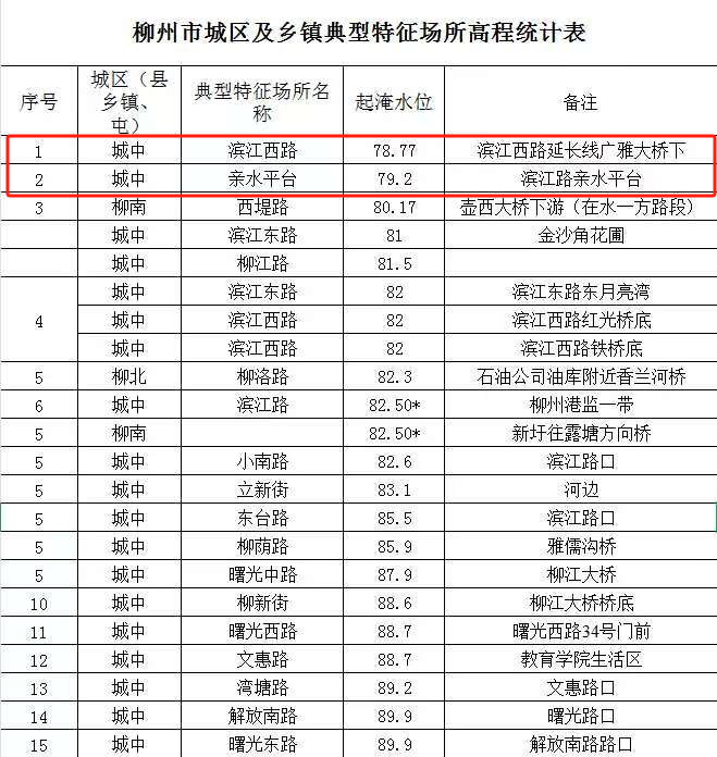 柳州市水文中心6月20日8時信息:預計柳江柳州水文站水位將於20日14時前後漲至親水平台(79.2米),未來24小時,柳江柳州水文站最高水位在81米以下。根據相關數據顯示,柳江水位至79.2米,濱江西路延長線廣雅大橋下、濱江路親水平台都將被淹。
