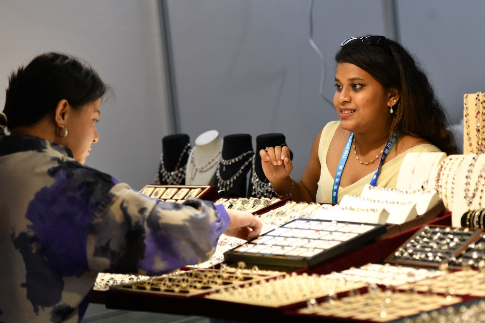 6月19日,斯里蘭卡展區的展商向顧客推介特色飾品。新華社發(彭奕凱 攝)
