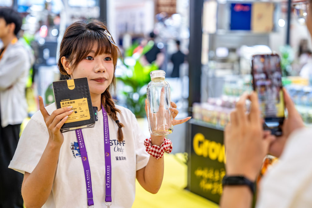 6月19日,一名參展商在第9屆中國—南亞博覽會咖啡產業館直播推介雲南小粒咖啡。新華社記者胡超 攝