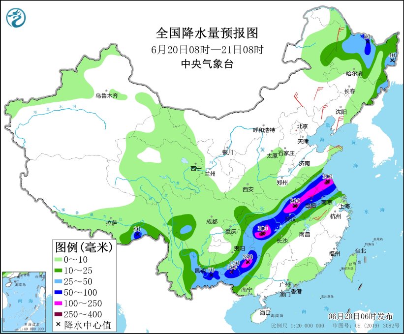 預計,6月20日08時至21日08時,江蘇中北部、安徽中北部、河南東南部、湖北中東部和南部、湖南北部、貴州南部、廣西北部、雲南東南部等地有暴雨,其中,江蘇中北部、安徽中北部、河南東南部、湖北東北部、湖南北部、貴州東南部、廣西北部等地的部分地區有大暴雨,局地有特大暴雨(250~350毫米)(見圖1)。上述部分地區伴有短時強降水(最大小時降雨量20~50毫米,局地可超過80毫米),局地伴有雷暴大風等強對流天氣。中央氣象台6月20日06時**繼續發佈暴雨橙色預警。