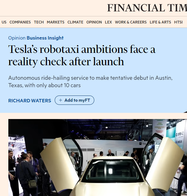 外媒指出,特斯拉的市值在很大程度上依賴於其即將從自動駕駛出租車網絡中獲利的希望。然而,儘管奧斯汀的首秀是邁出的第一步,但特斯拉仍需證明其基於攝像頭的系統能夠達到近自動駕駛級別,並解決監管調查和安全問題。