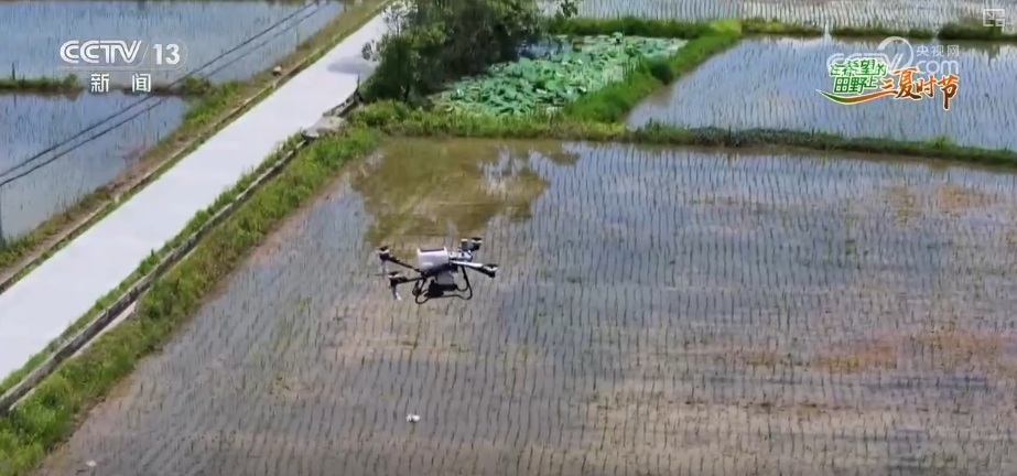 在另一塊稻田裏,植保無人機正在對剛插好的稻苗噴灑肥料。農場負責人表示,單季稻插秧後3—7天,就需要根據稻苗返青和分櫱的情況施肥,以促進它的生長。用無人機施肥可精準控制用量,一天能管200多畝,同時,還能節省30%的肥料。