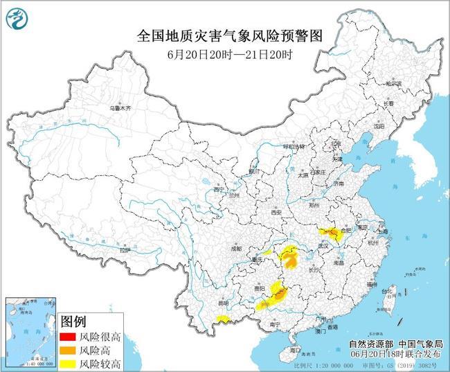 自然資源部與中國氣象局6月20日18時聯合發佈地質災害氣象風險預警: