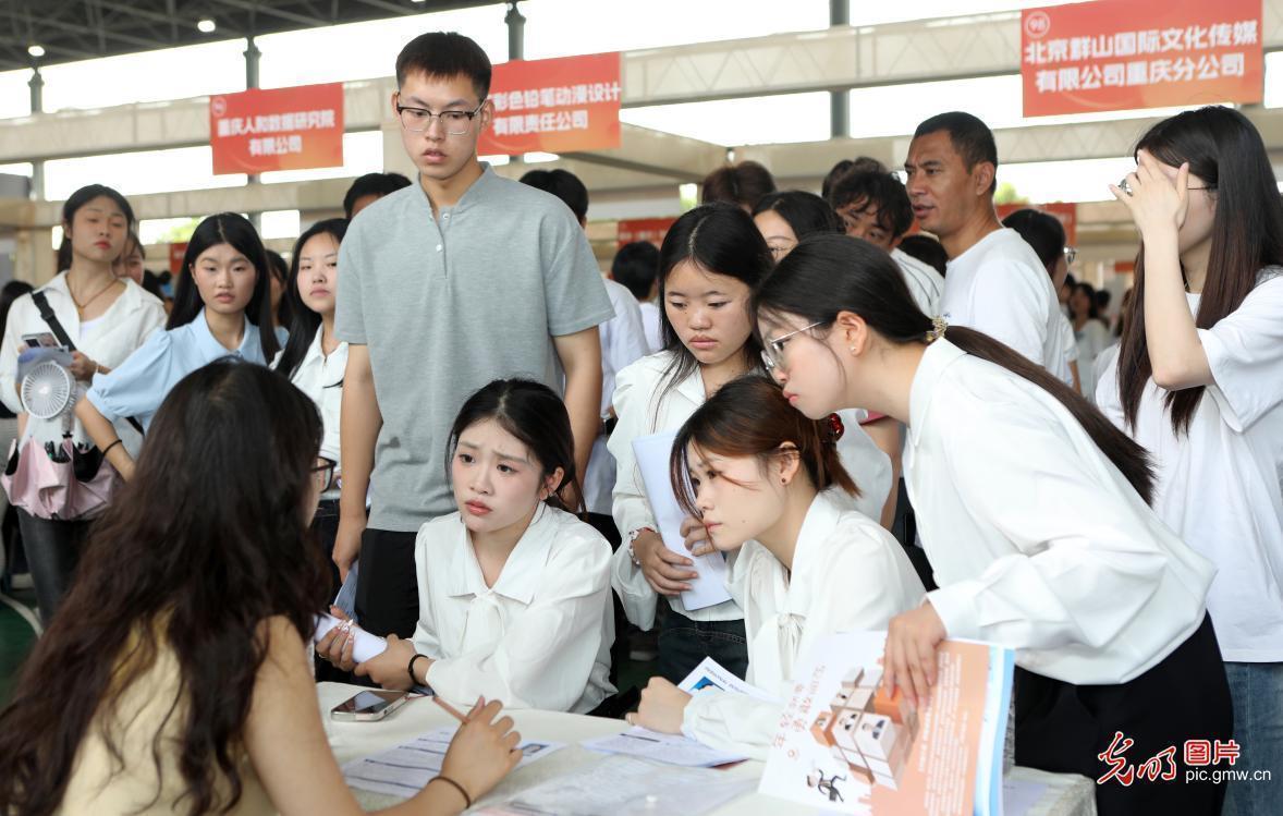 2025年6月17日,由安徽省亳州市人力資源和社會保障局主辦的2025屆畢業生校園雙選會在亳州職業技術學院舉行,吸引了107家優質企業現場招賢納士,共為畢業生提供就業崗位9102個,涵蓋醫藥健康、智能製造、信息技術、商貿服務、文化教育、建築工程等領域。圖為畢業生在雙選會上尋找適合自己的就業崗位。(劉勤利攝/光明圖片)