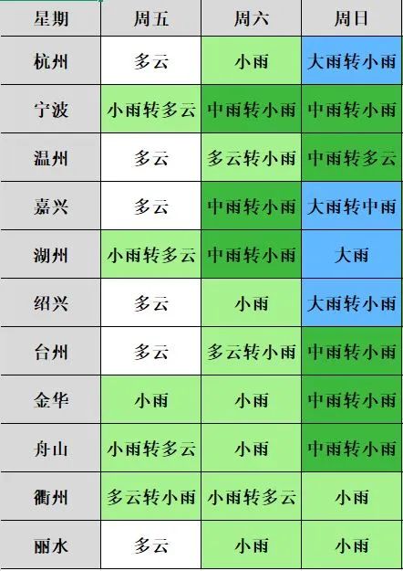 今天夜裏到後天: 浙北和浙中西部地區陰部分有中到大陣雨或雷雨,局部暴雨到大暴雨;其它地區多雲,午後部分有雷陣雨。