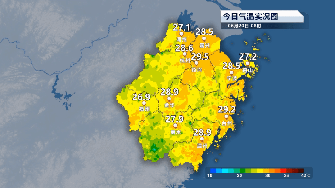 今天午後開始一直到24日,受梅雨帶南壓影響,全省雷陣雨較明顯,呈現出面廣點強、降雨時空分佈不均等特點,杭嘉湖、紹金衢等地部分中雨,局部暴雨到大暴雨,其它地區也有分散性暴雨;以上有雷雨地區局部伴有短時強降水(最大小時雨強60~90毫米)和8~10級雷雨大風等強對流天氣。