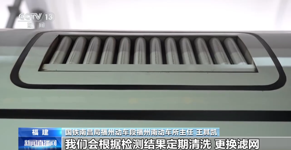 國鐵南昌局福州動車段福州南動車所主任 王其凱: 在動車組各個風口處,還安裝了專門用於過濾、淨化空氣的空調棉和防塵濾網,它們相當於動車組的“肺”,我們會根據檢測結果定期清洗,更換濾網。