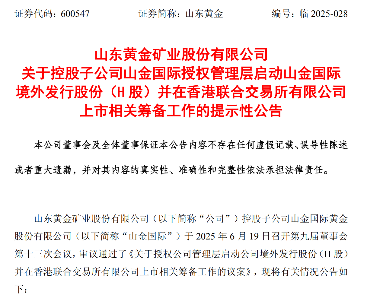 【環球網財經綜合報道】6月20日,據山東黃金公告,其控股子公司山金國際黃金股份有限公司(簡稱“山金國際”)董事會已審議通過議案,授權管理層啓動境外發行H股並在香港聯合交易所上市的相關籌備工作。
