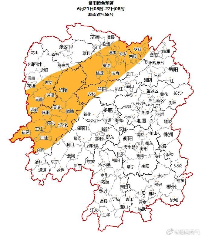 湖南省氣象台06月21日06時發佈暴雨橙色預警:預計21日08時至22日08時,湘西、湘北部分地區將出現暴雨,其中懷化中北部、益陽西部局地大暴雨(100~180毫米),並伴有短時強降水(最大小時雨強40~60毫米)等強對流天氣,請加強防範。